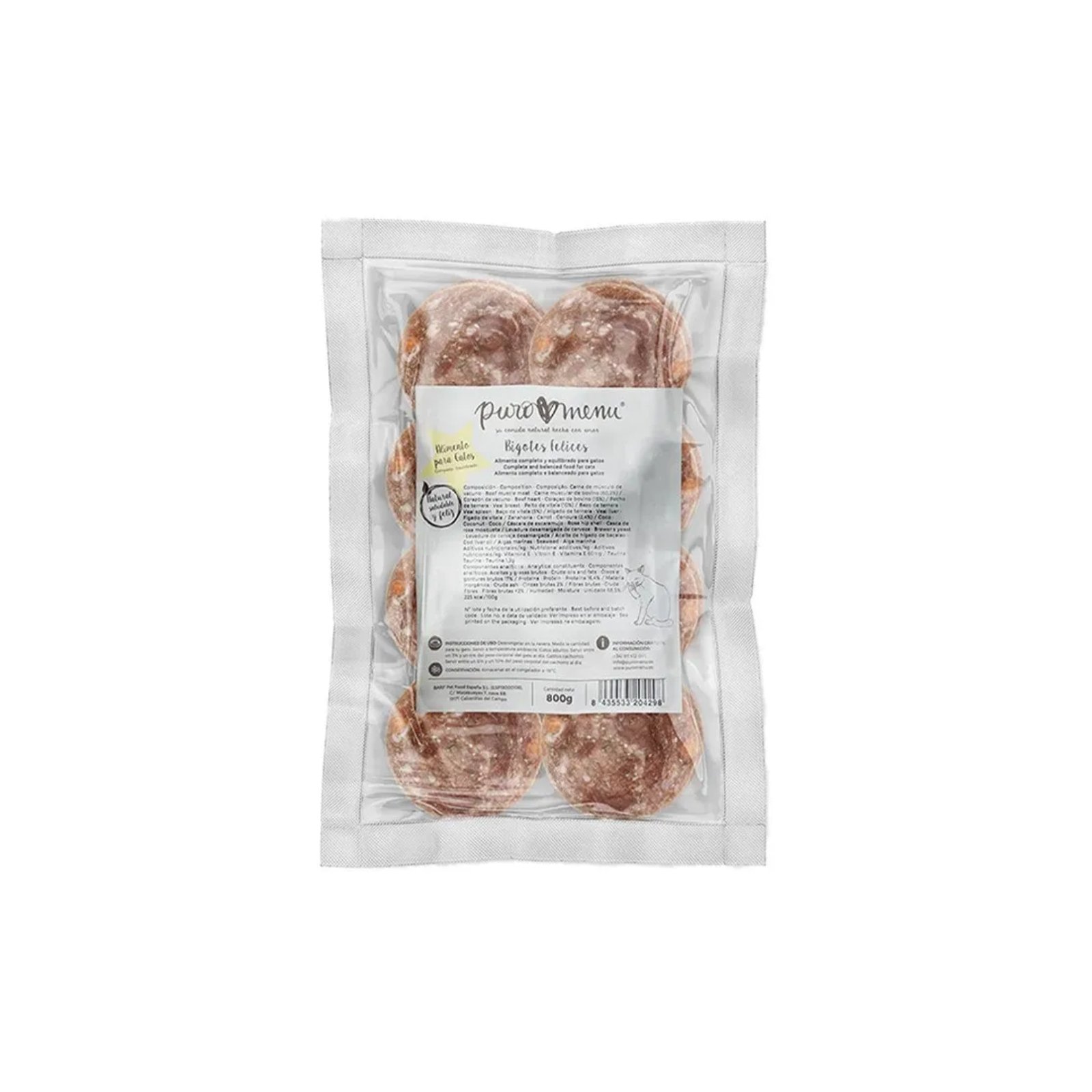 PURO MENU Happy Whiskers Beef Medallones 800g is a complete and balanced natural food for cats and kittens of all breeds. Made with 95% beef, enriched with taurine, and prepared with a single animal protein source, this grain-free recipe is ideal for cats that benefit from high-meat, low-carbohydrate nutrition. The 800g pack contains 16 practical 50g medallions for easy portioning and serving.