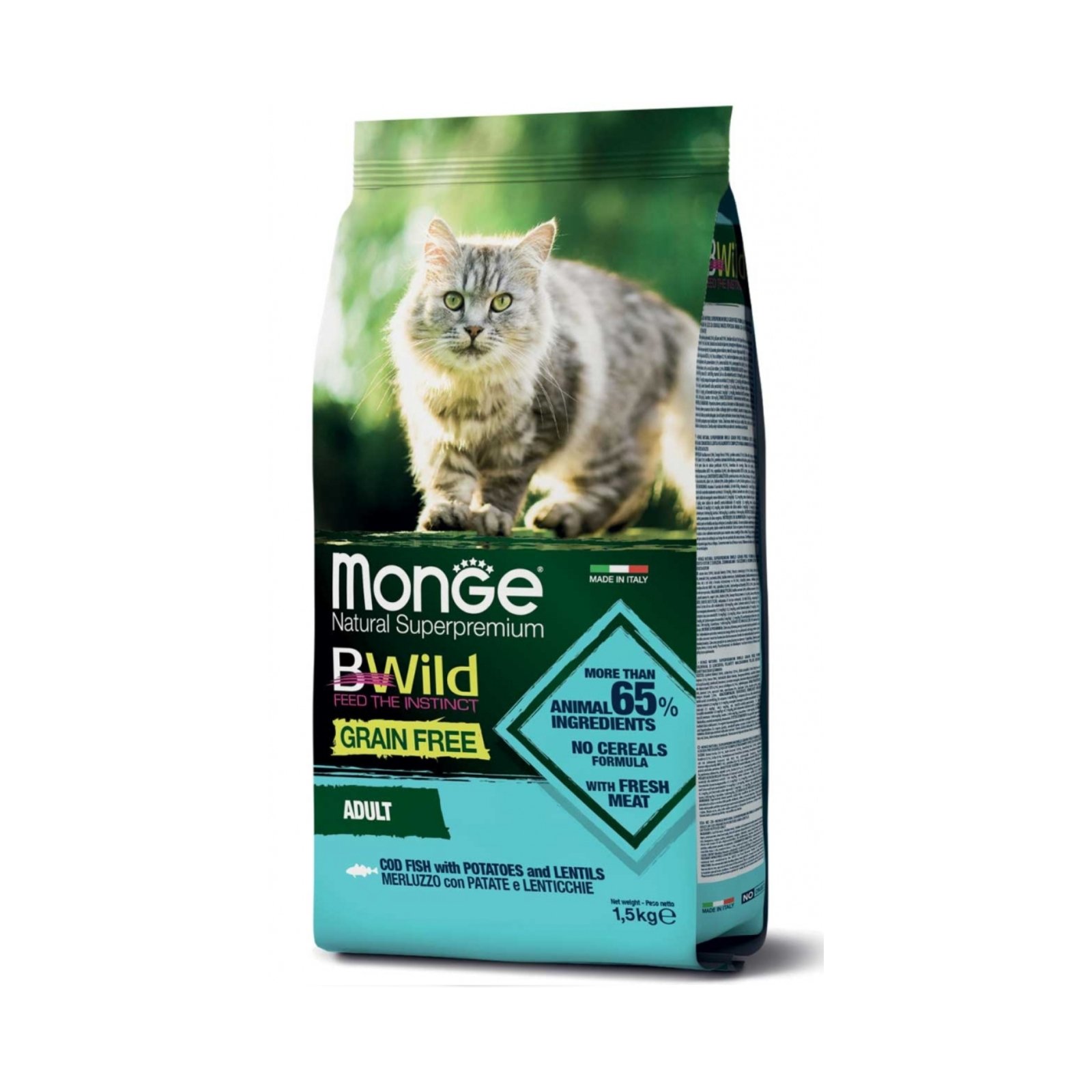 MONGE BWILD FEL GRAIN FREE ADULT CATS CODFISH POTATOES AND LENTILS 1.5kg