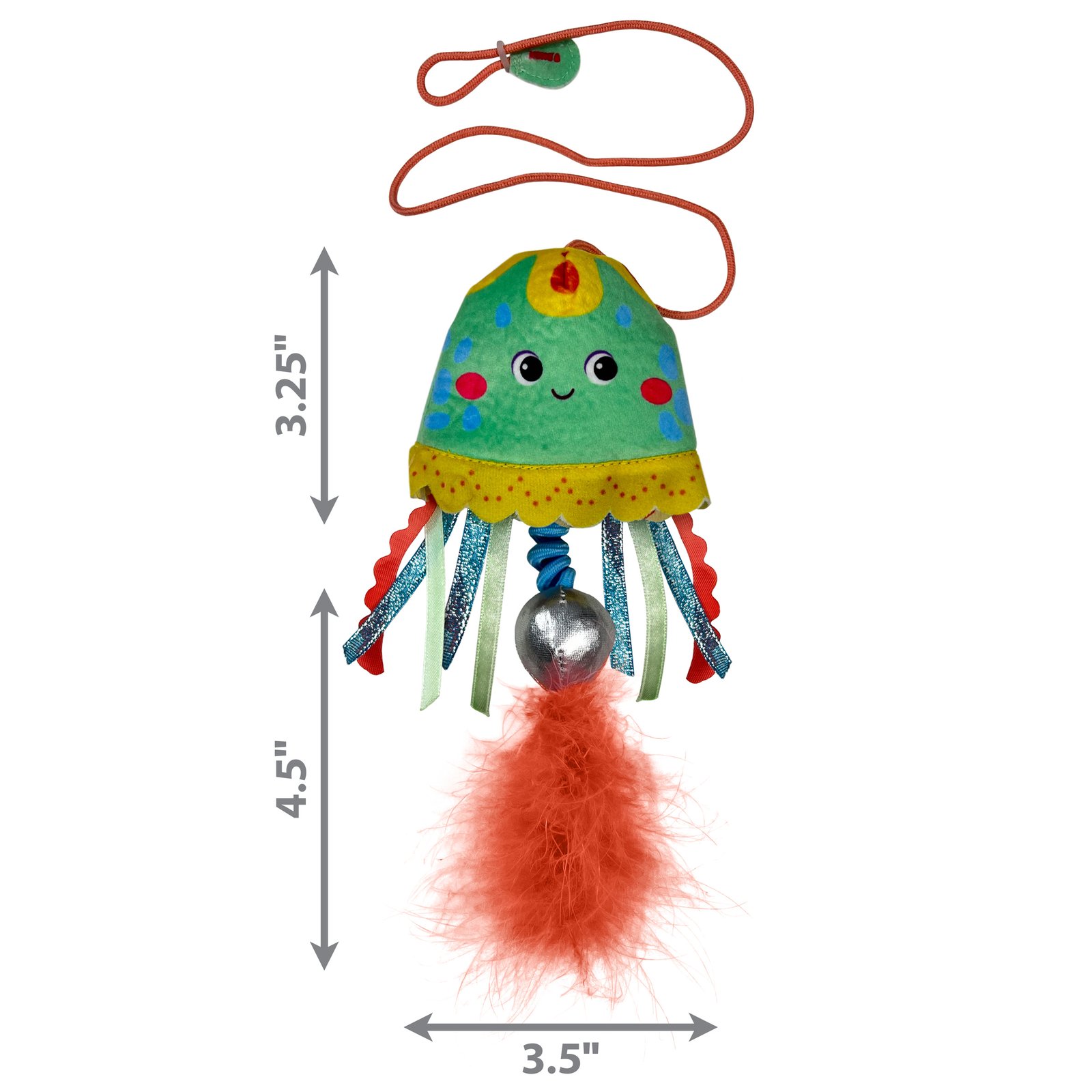 KONG Jellyfish Teaser’s a multi-sensory bundle of instinct-satisfying play that attaches to a finger for interactive adventures—or a doorknob or handle for solo “undersea” exploits. Ball and feather bounce on elastic cord, inviting capture while irresistibly dangling ribbon tentacles entice batting. Bell, crinkle and KONG North American Premium Catnip prolong play.