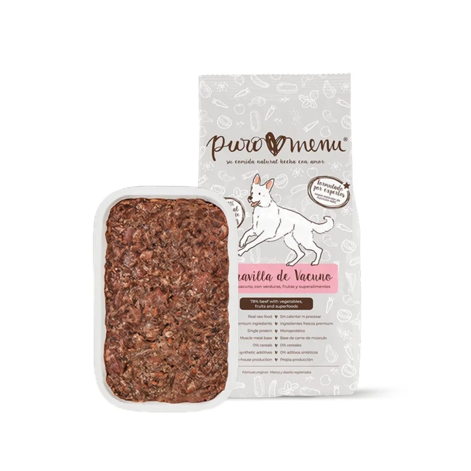 PURO MENU Beef Wonder Bandeja is a complete, natural BARF dog food made with premium beef to provide balanced, nutritious meals for dogs of all breeds and life stages. This grain‑free recipe features high‑quality beef as the primary protein source, delivering easily digestible energy to support muscle development, healthy digestion, and overall vitality.