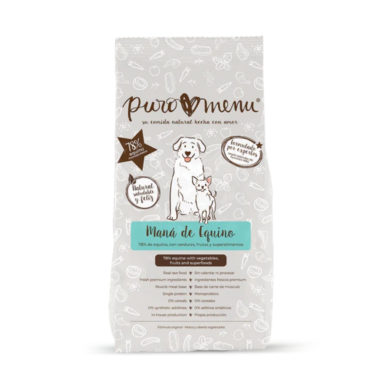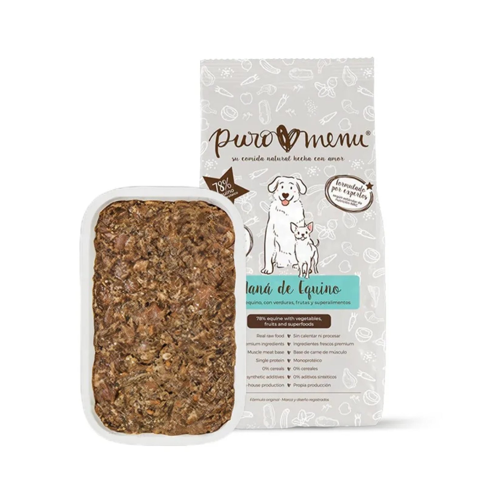 PURO MENU Equine Manna Bandeja is a complete, natural BARF dog food crafted with premium horse meat to provide balanced and nutrient‑rich daily nutrition. This grain‑free recipe features high‑quality horse protein, offering easily digestible energy to support lean muscle, robust immune health, and overall vitality for dogs of all breeds and life stages.