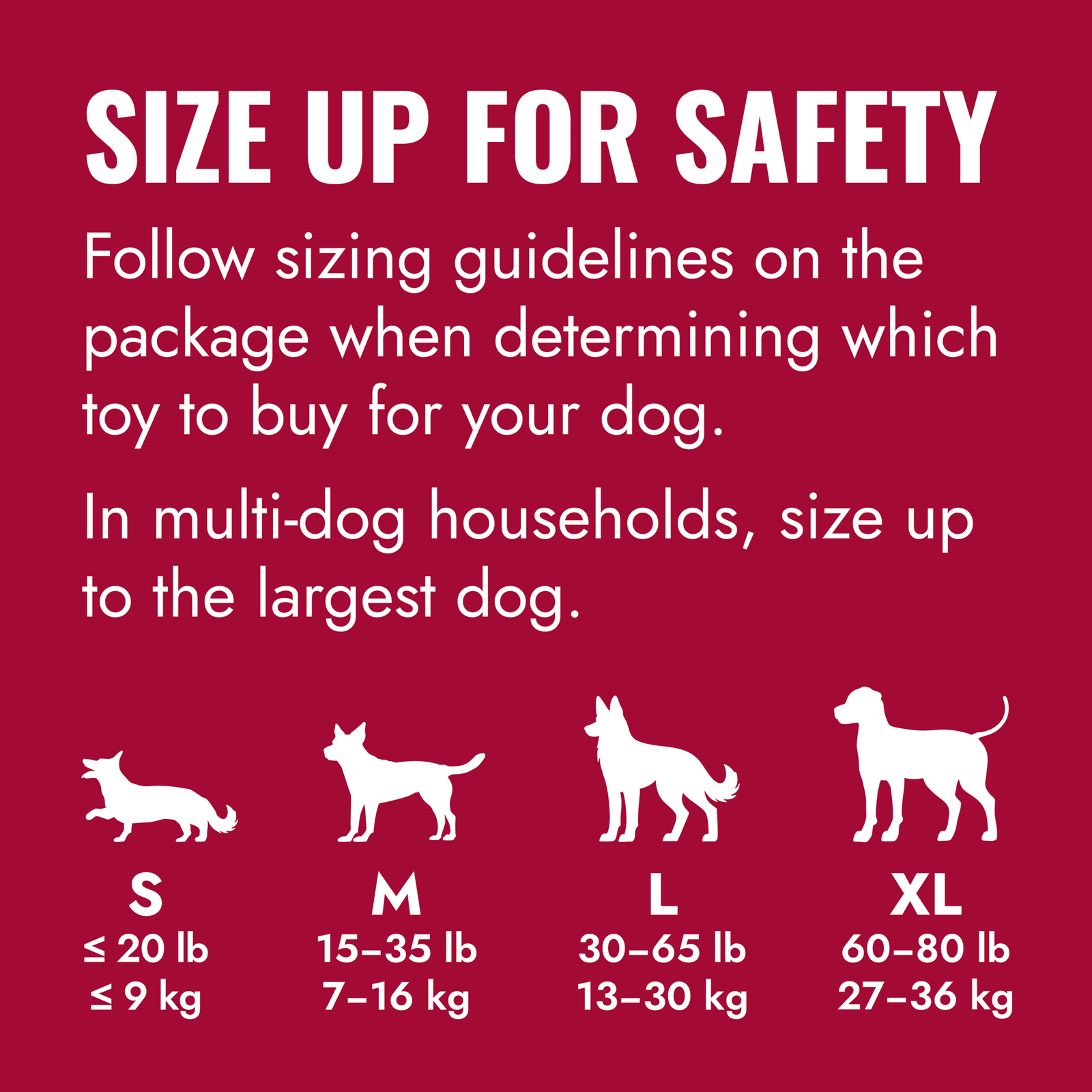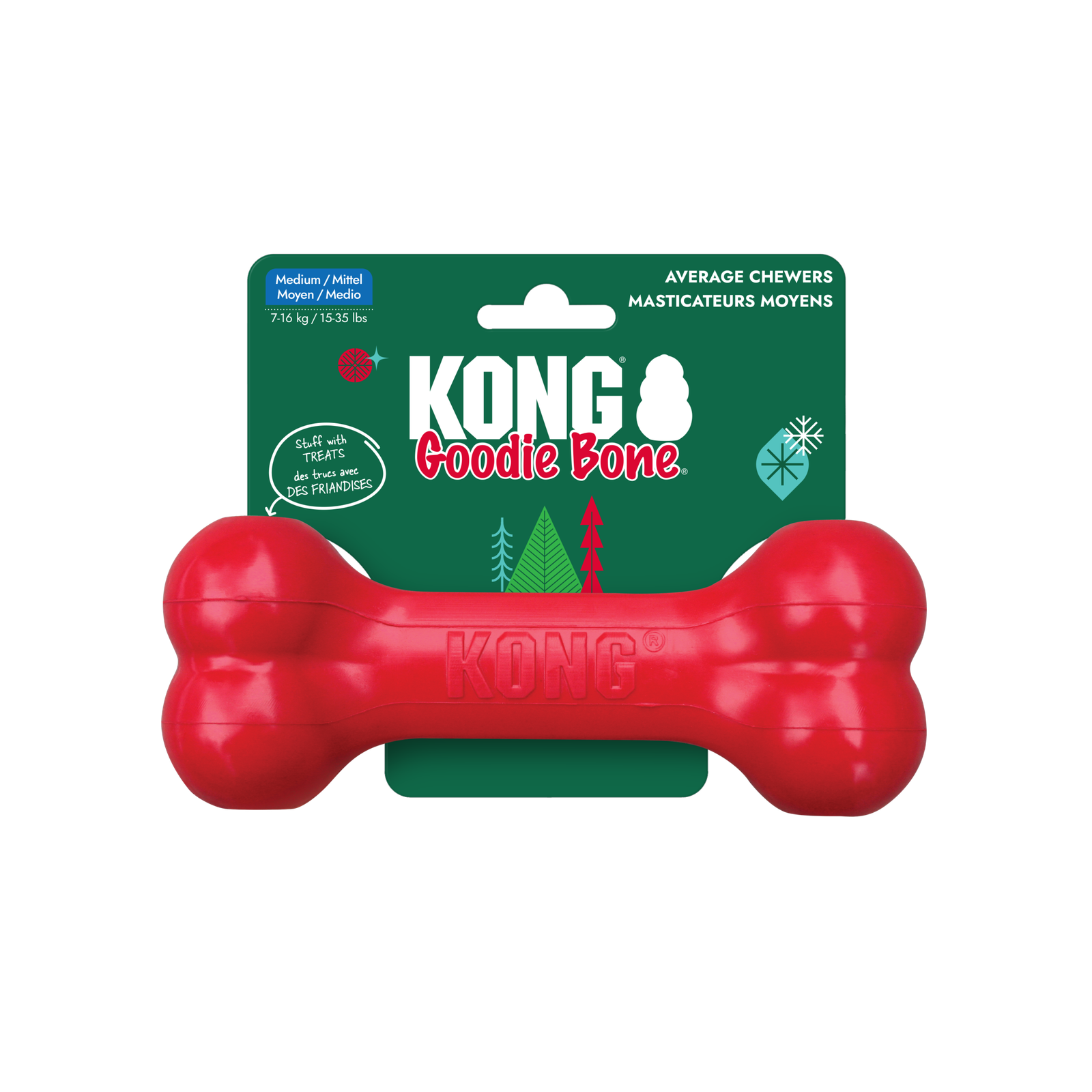 Dogs have an instinct to scavenge. Whether it’s a treat-dispensing toy, a wastebasket, or underneath the dinner table, scavenging for food is simply part of their nature. With a KONG Goodie Bone, your pup can satisfy this instinct with appropriate behavior. Its Goodie Grippers can be stuffed with KONG Easy Treat, KONG Ziggies, and other yummy treats to turn it into a fun scavenging challenge. Our Holiday Goodie Bone is made with high-quality natural rubber, allowing it to withstand countless hours of chewing—and unlike nylon, hard plastics, sticks, or bones, rubber doesn’t splinter and is gentle on dogs’ teeth and gums.