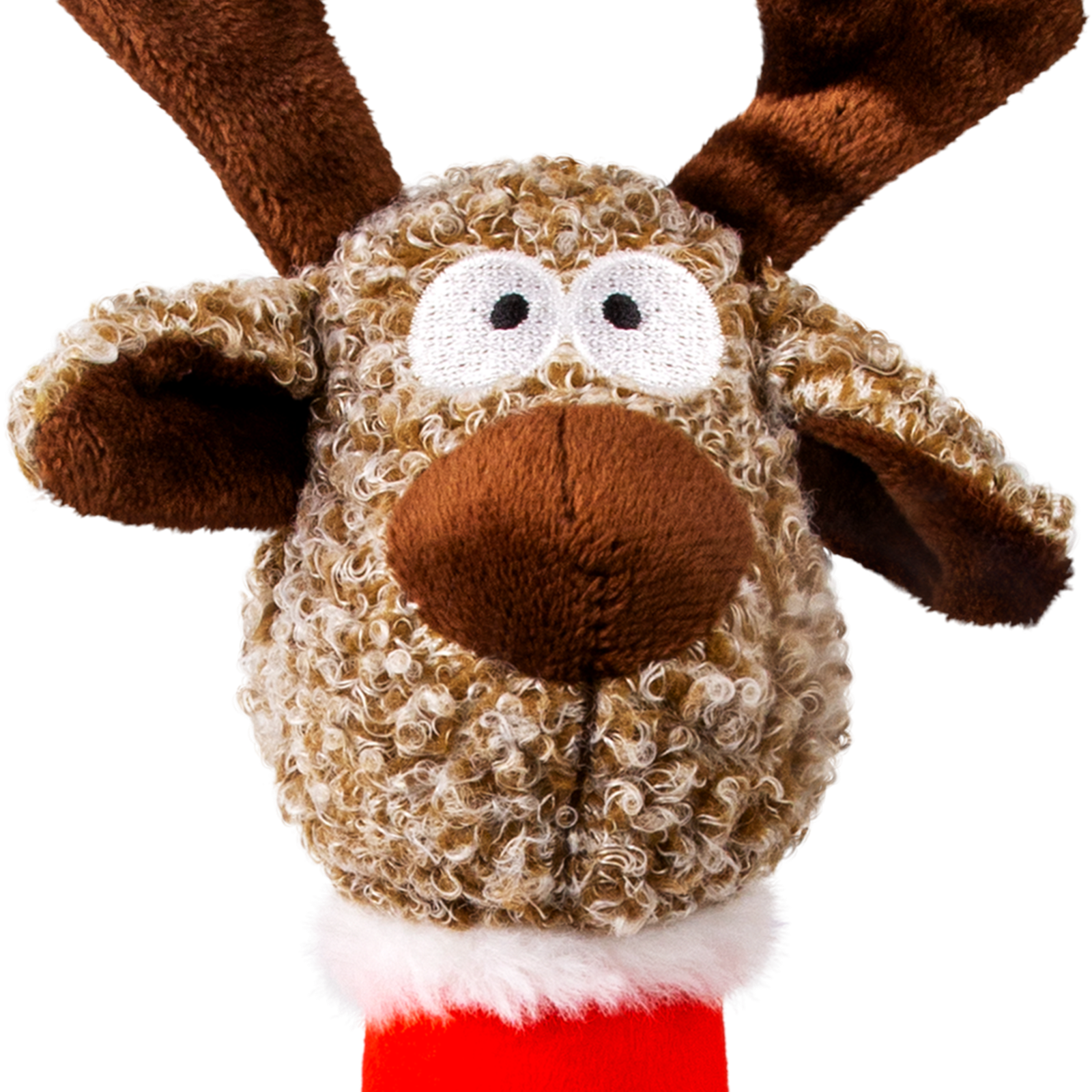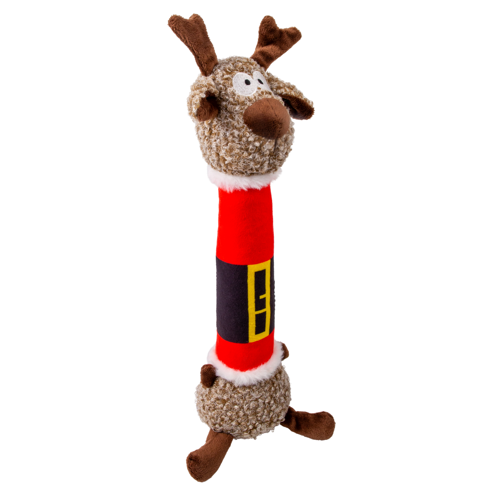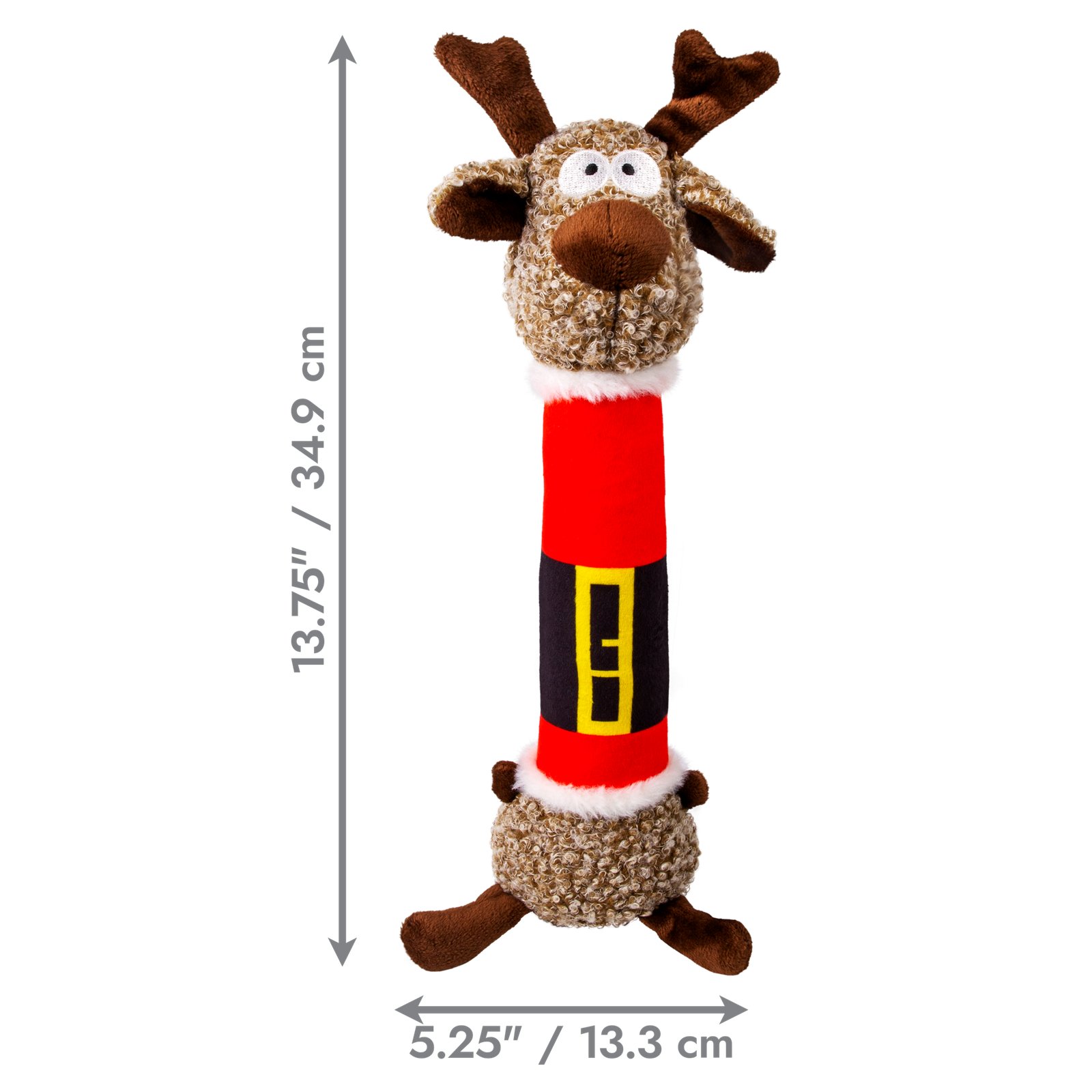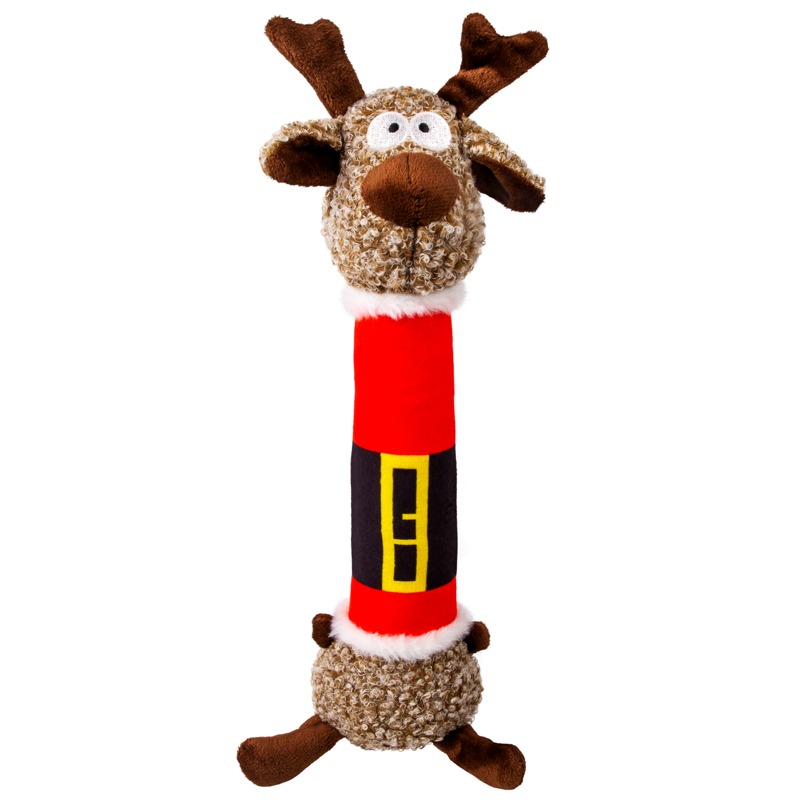 This long, skinny reindeer’s the ideal shape for thrashing fun—and sliding down chimneys! Low-tone squeaker prolongs play, holiday sweater brightens the fun.