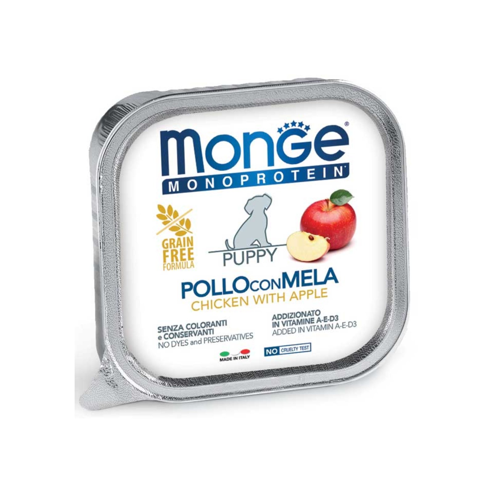 MONGE Monoprotein Puppy Dog Paté Chicken with Apple 150 g is a complete wet dog food specially crafted for puppies of all breeds. This highly palatable paté is formulated with a single animal protein source — high-quality chicken — and real apple, a natural source of vitamins and minerals, to support healthy growth, development, and digestive comfort during early life stages.