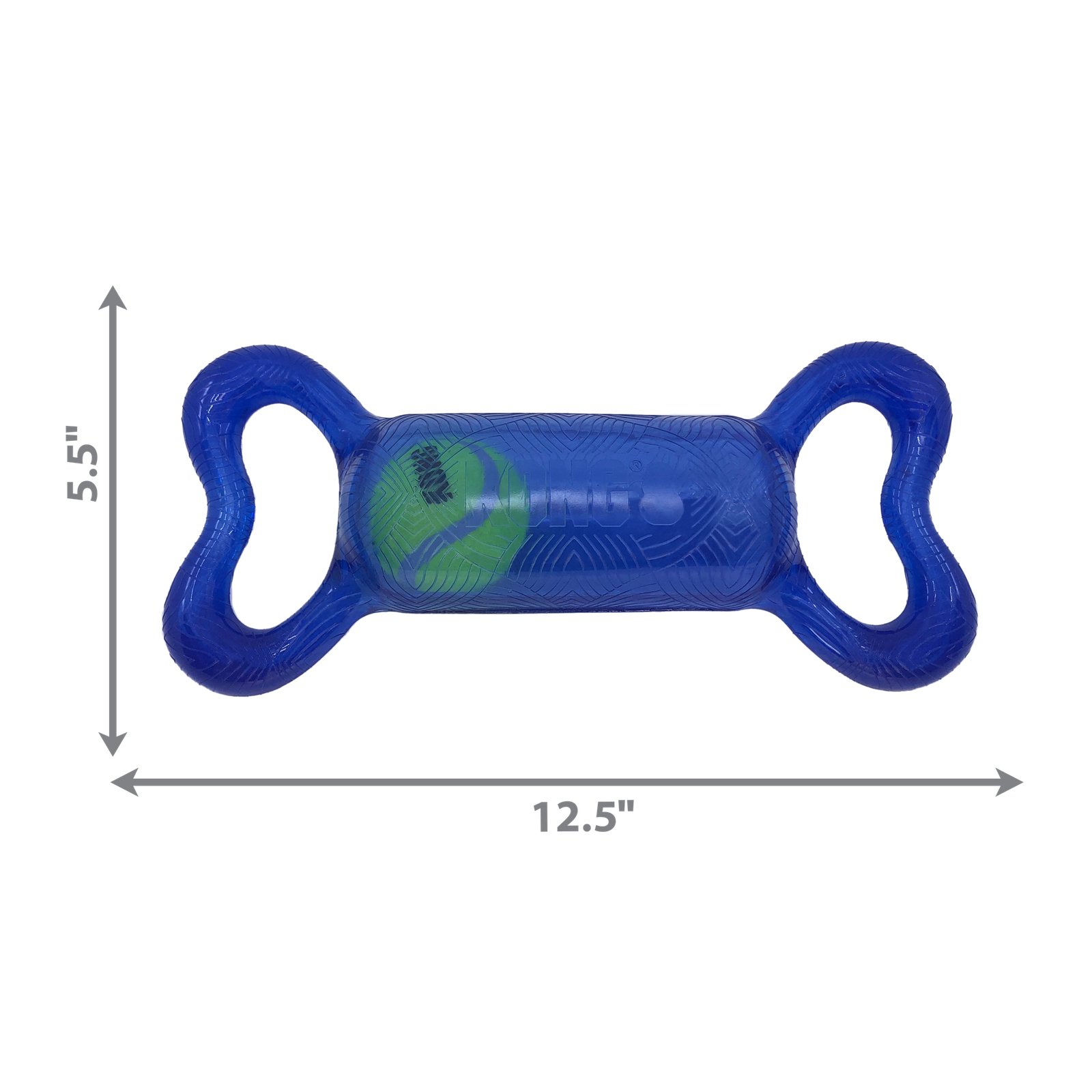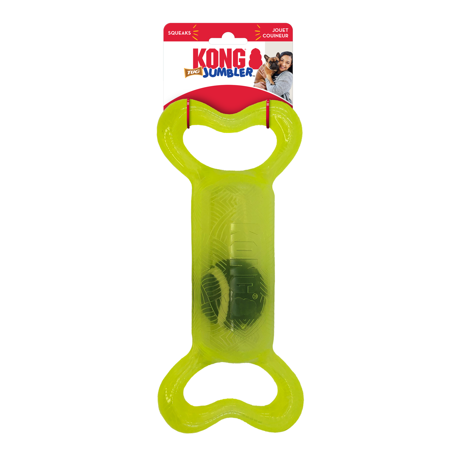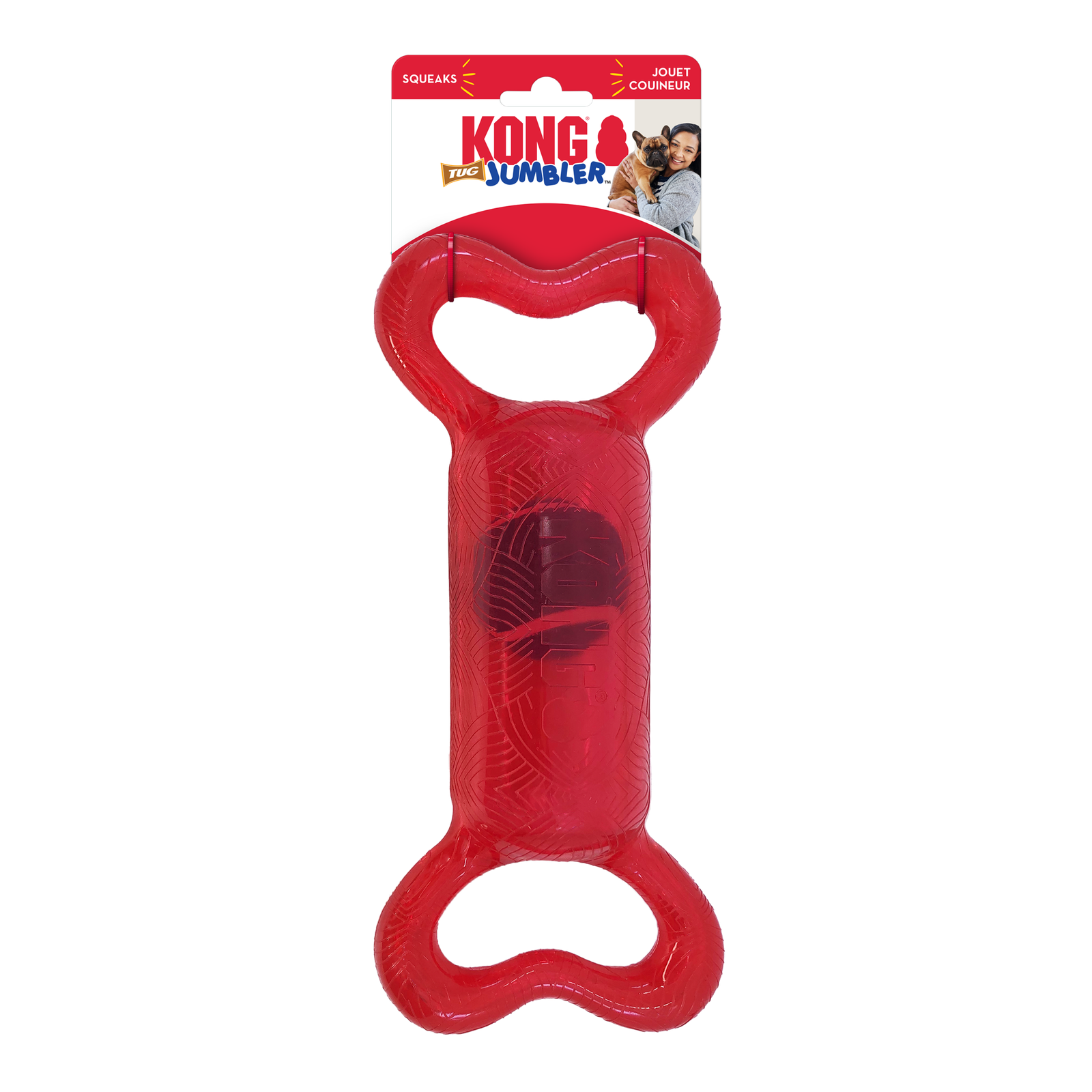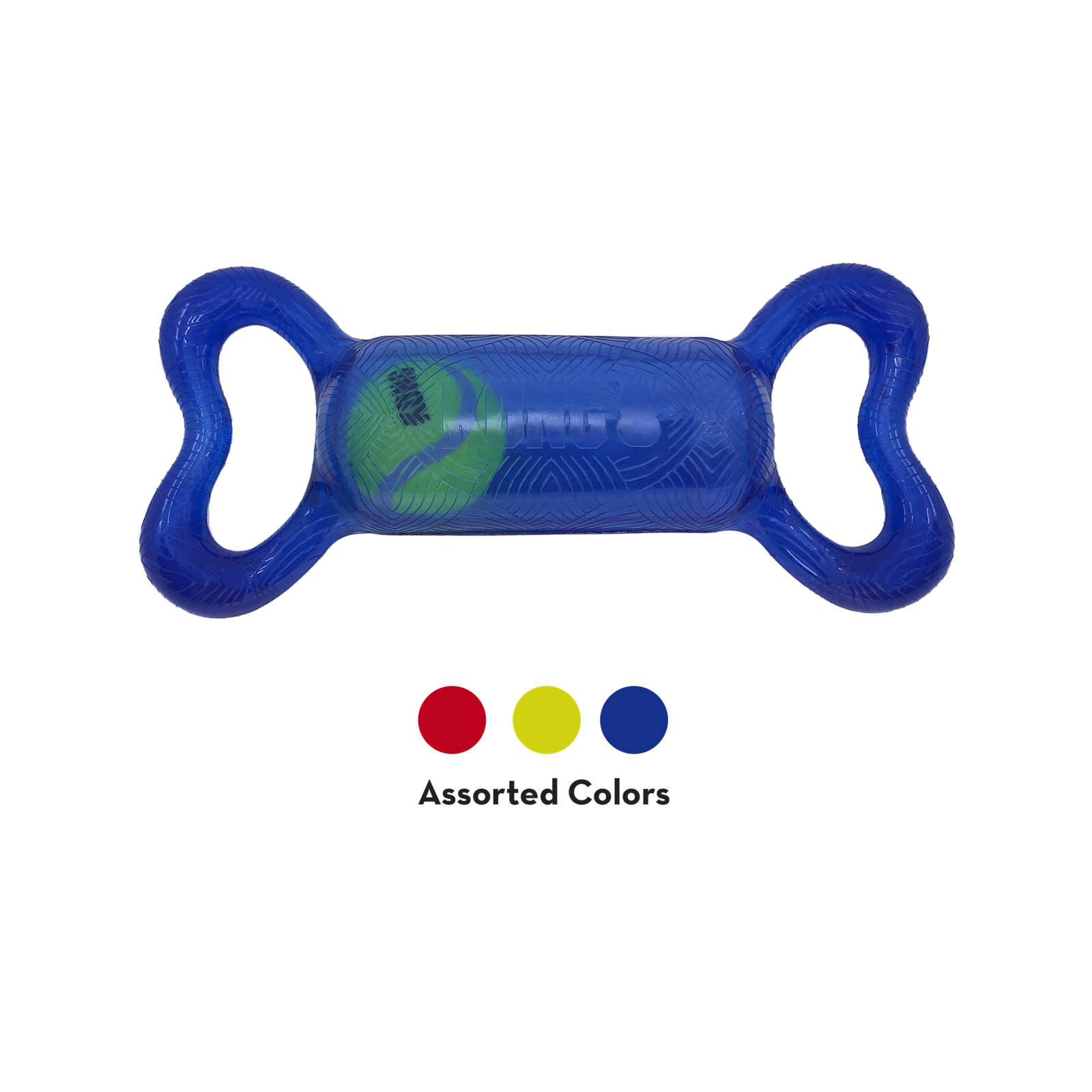 KONG Jumbler Tug Bone’s rolling interior tennis ball and loud squeak spark tug-and-fetch fun. This durable toy is built to last through tough play with two handles that make tugging and shaking easy for long-lasting rounds of interactive play.