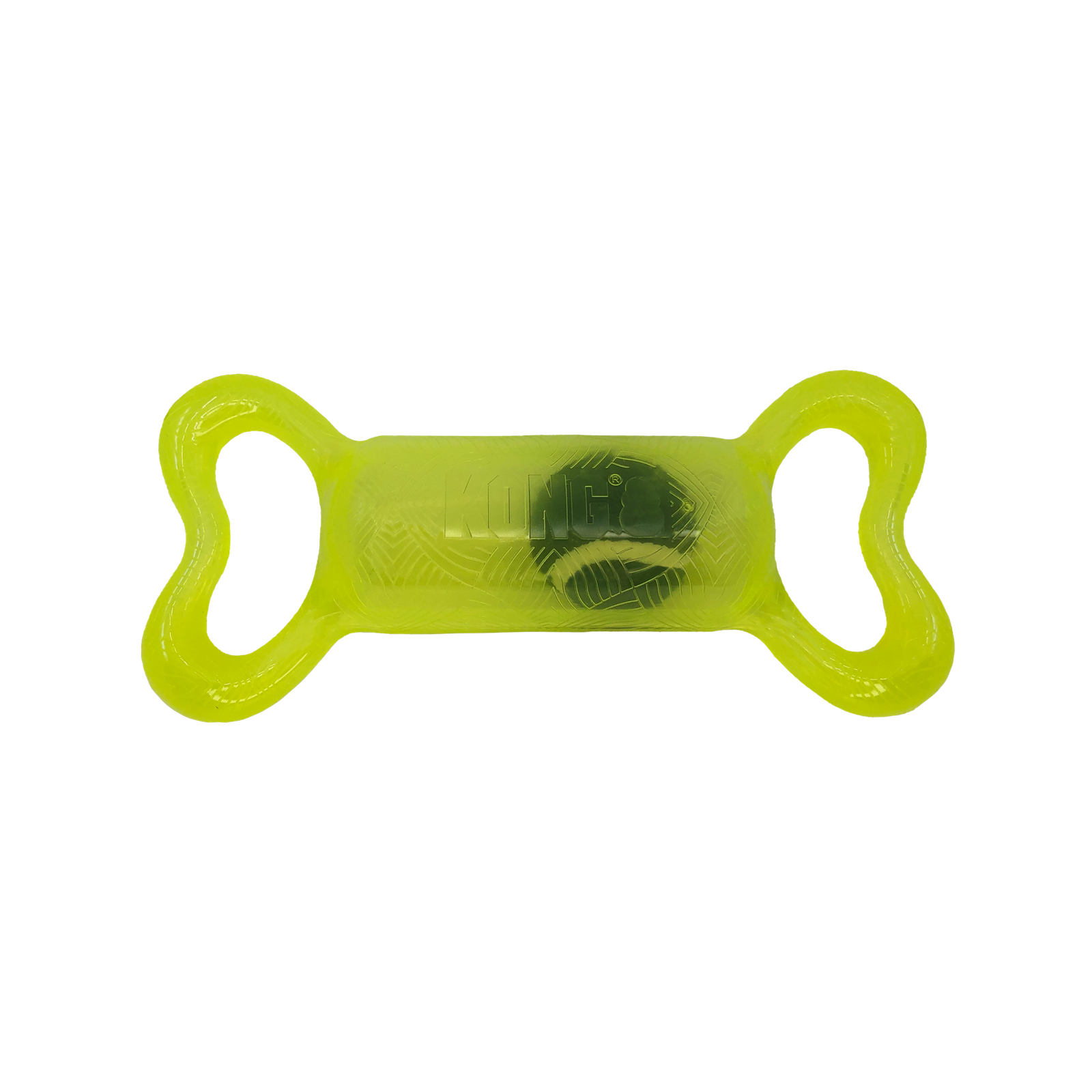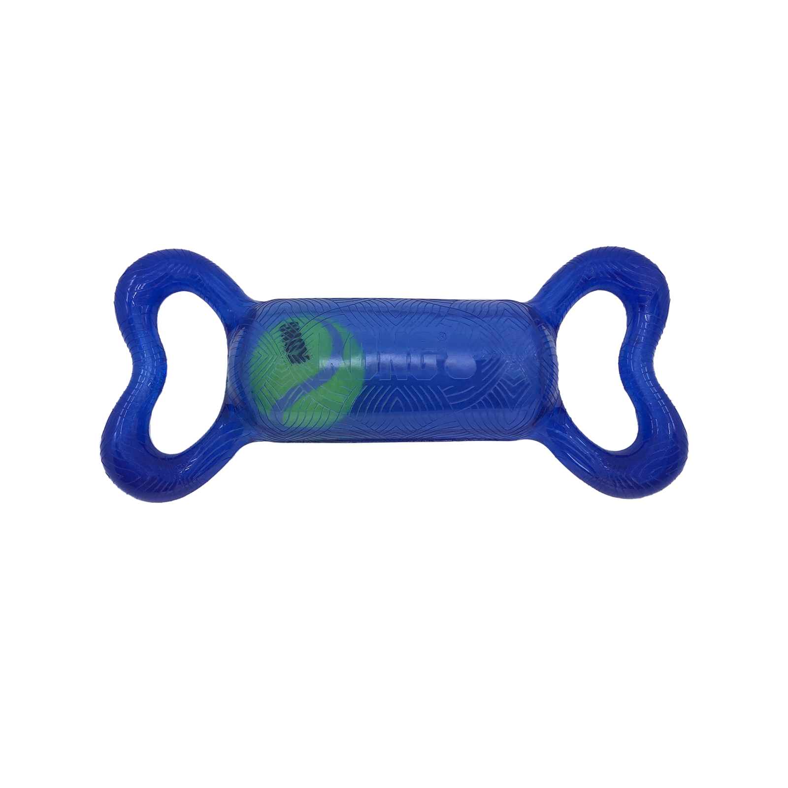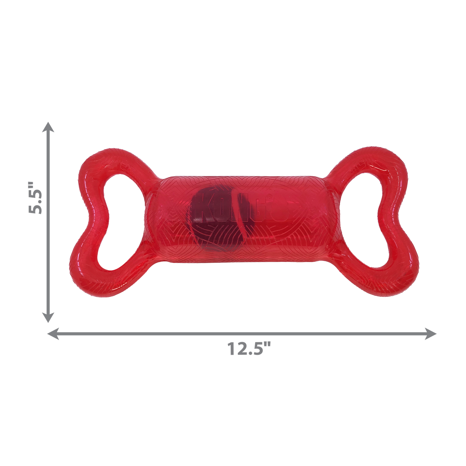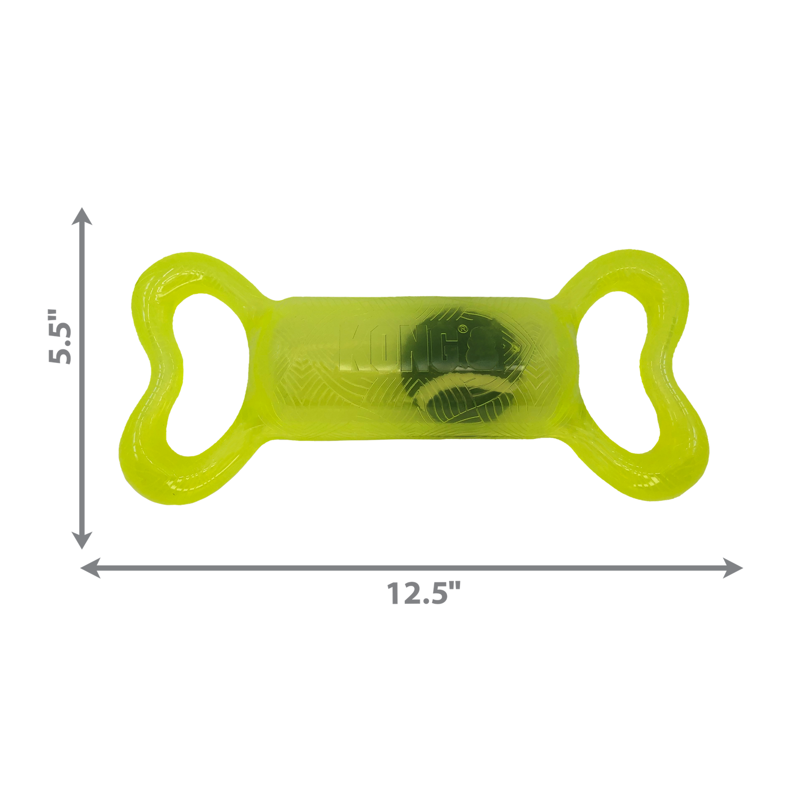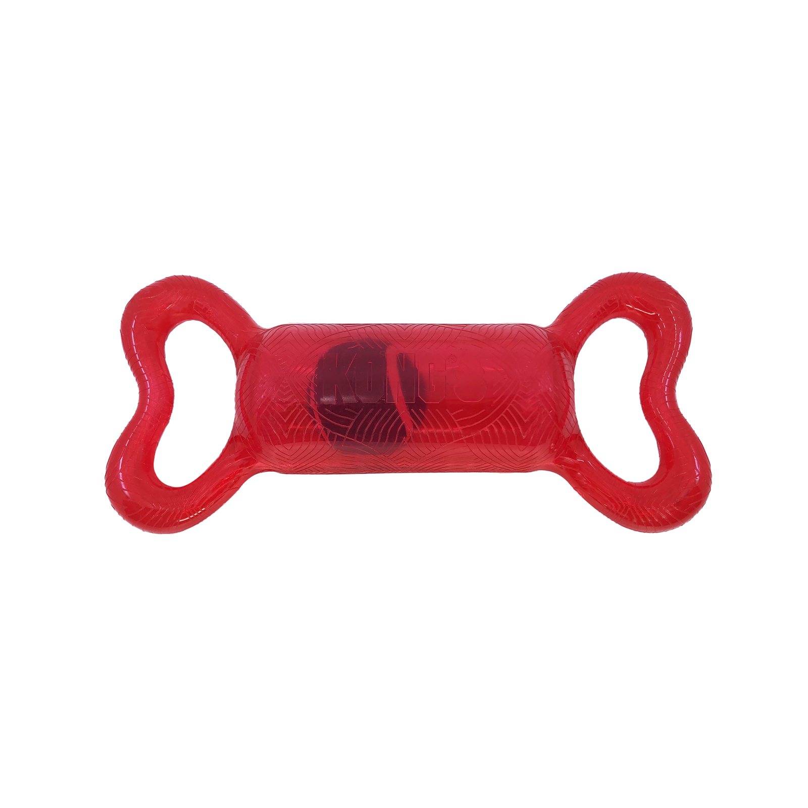 KONG Jumbler Tug Bone’s rolling interior tennis ball and loud squeak spark tug-and-fetch fun. This durable toy is built to last through tough play with two handles that make tugging and shaking easy for long-lasting rounds of interactive play.