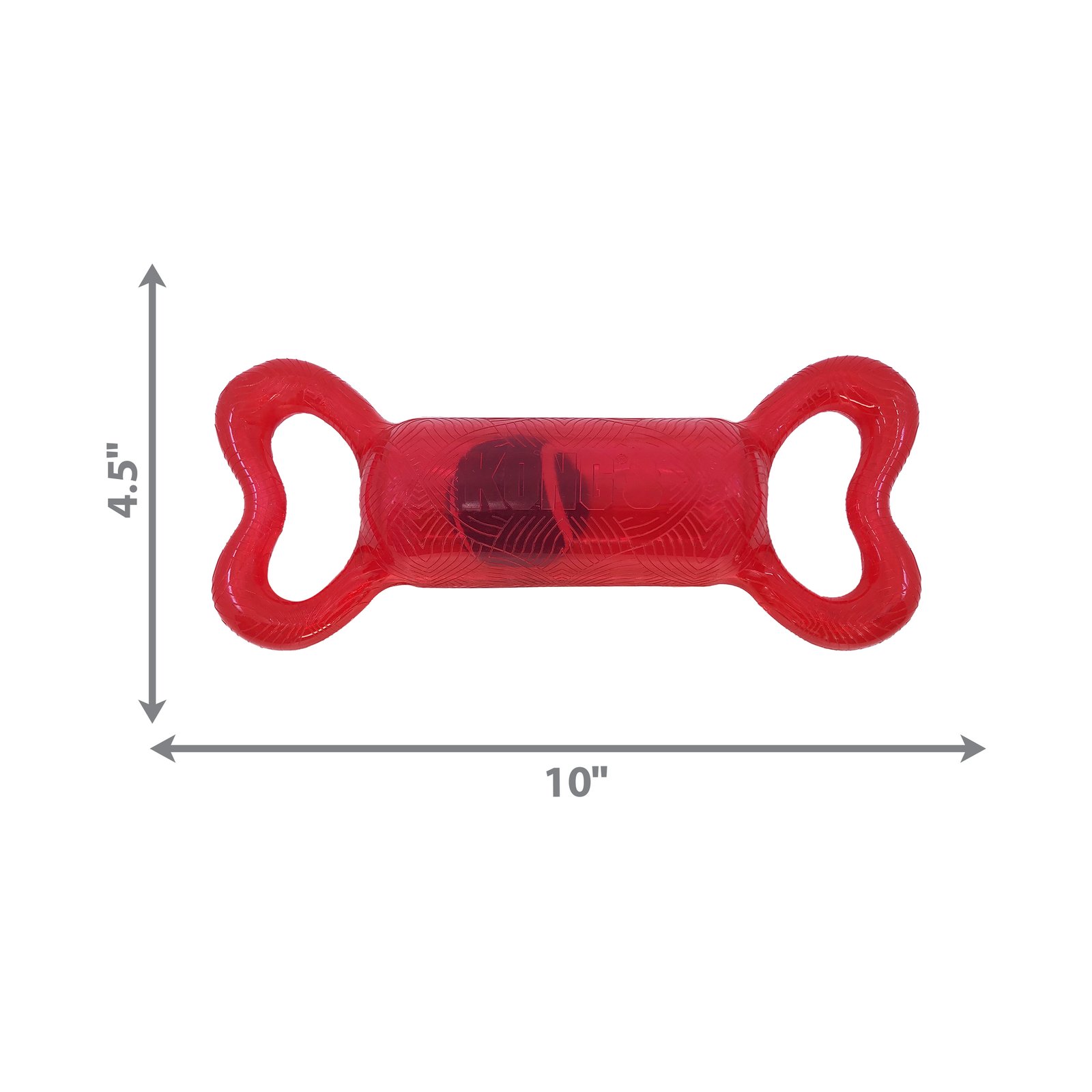 KONG Jumbler Tug Bone’s rolling interior tennis ball and loud squeak spark tug-and-fetch fun. This durable toy is built to last through tough play with two handles that make tugging and shaking easy for long-lasting rounds of interactive play.