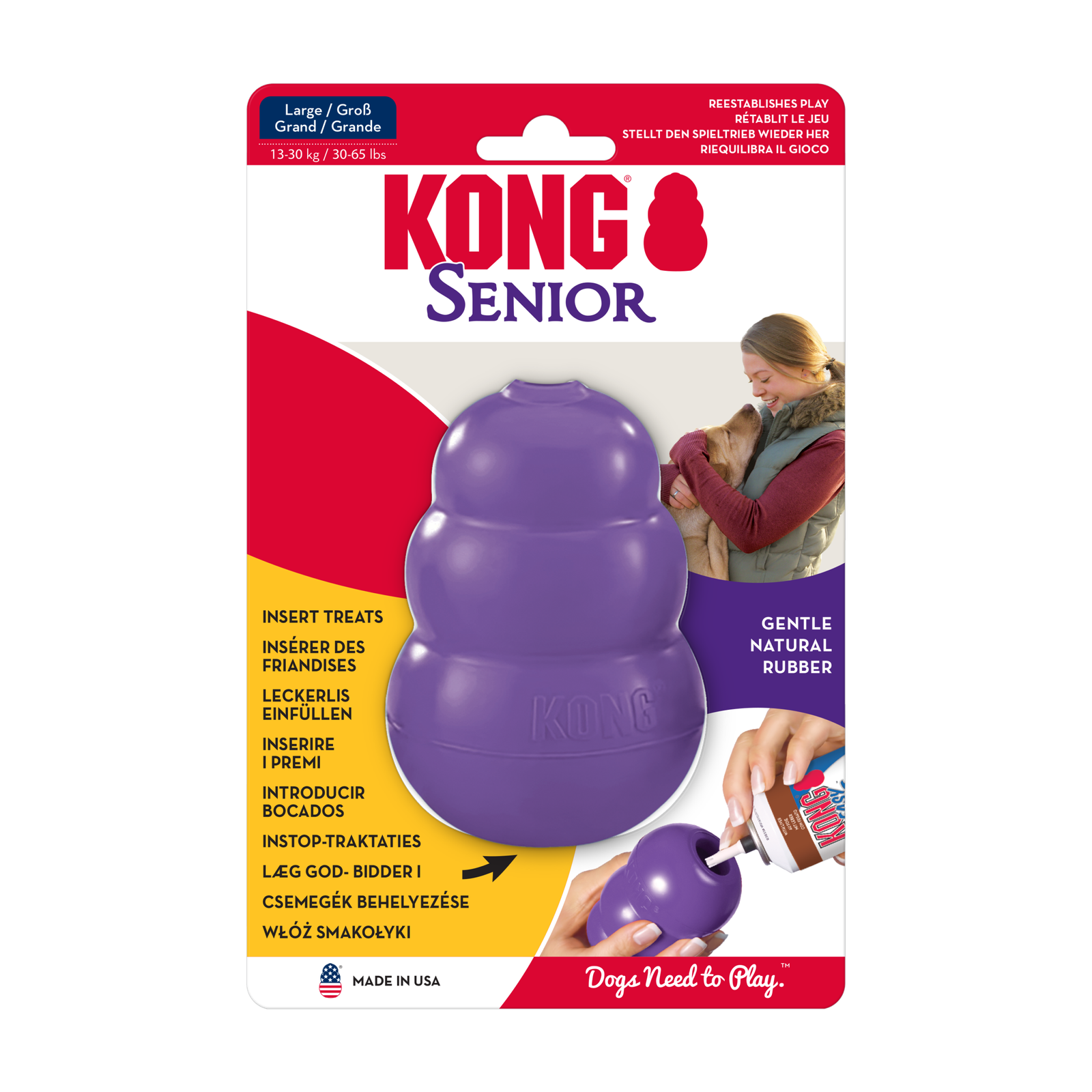 • KONG Senior rubber formula is customized for an aging dog’ chewing and play needs